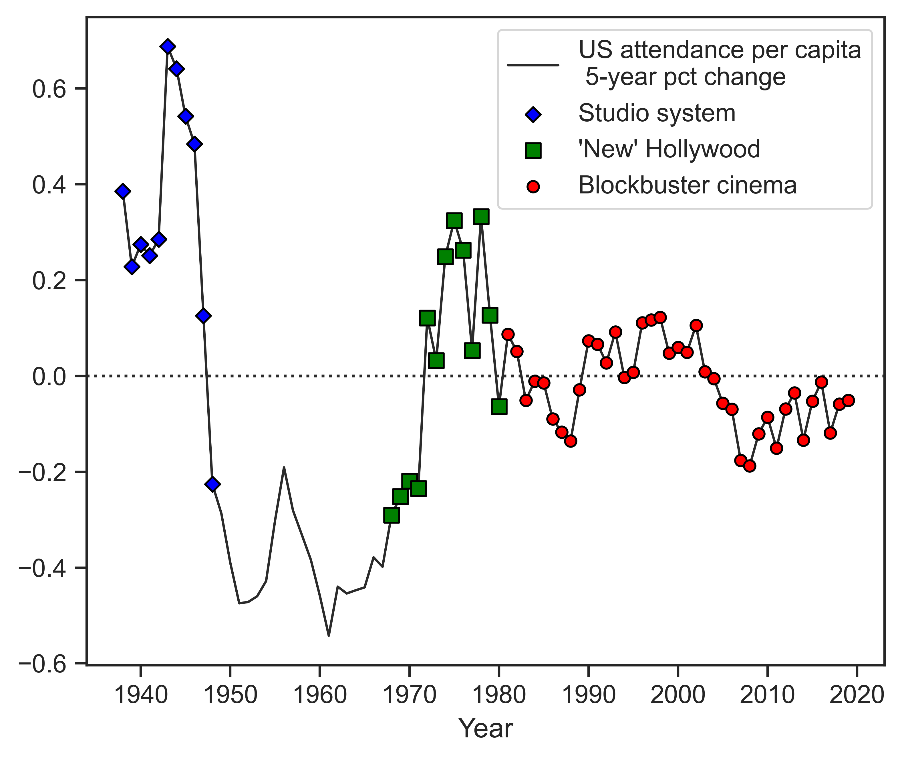 In terms of theatrical attendance in the United States, the “New” Hollywood era was successful. We can see this with two measures of success. Figure 2 shows how the period between 1968 and 1980 had high theatrical attendance of the top five films per year. (Ticket price inflation is why theatrical attendance in the blockbuster era is lower than what one would have expected it to be.) Figure 3 shows a five-year percent change for the per capita theatrical attendance in the United States. A percent change of the series makes the relevant historical shift easier to see; all per-capita theatrical attendance after the 1940s is low by comparison, as theatrical attendance plummeted with the decline of the studio era and the rise of television. Figure 3 demonstrates that, while the level of theatrical attendance per capita was still much lower than what came before it, “New” Hollywood was able to produce positive five-year growth rates after two decades of shrinkage.