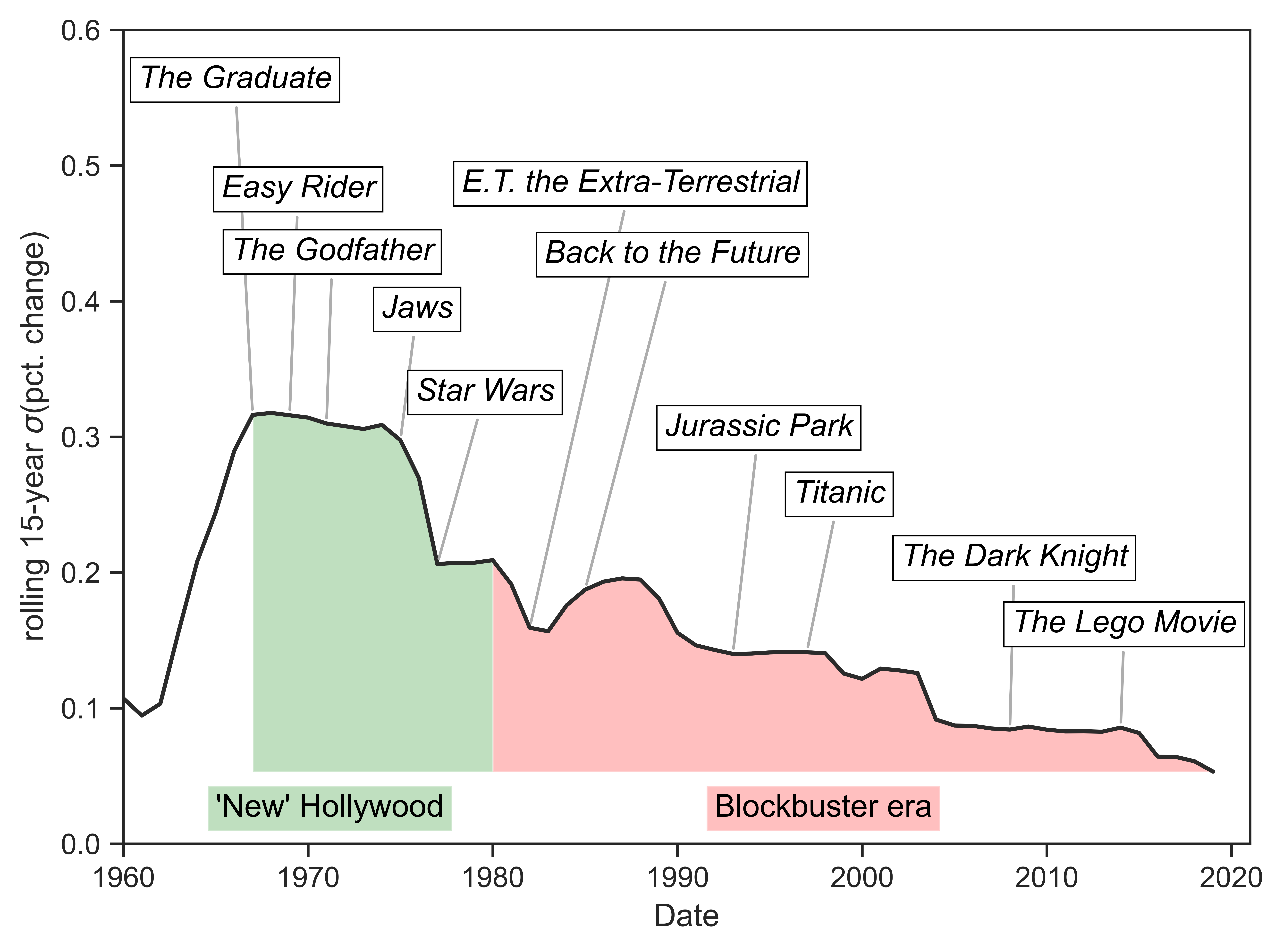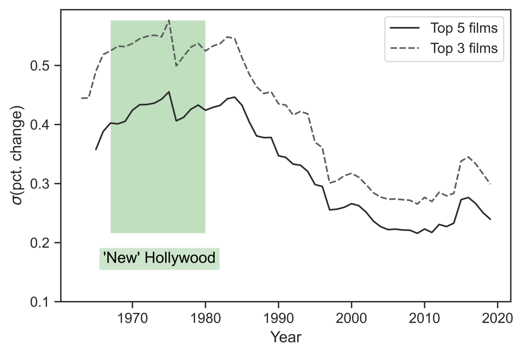 With data going into the late 1940s, the time series in Figure 6 confirms that, in terms of profits, the troublesome period was from the late 1960s to the last years of the 1970s, when risk spiked and stayed high. After the 1970s, risk steadily declined and continued to decline to 2019. The level of risk in 2019 is also lowest in the period from 1950 to 2019. The annotations in Figure 6 are meant to remind us of the film history that overlaps this reduction in risk. We might not know the contribution of each film to this decline–and there are many other important films in any story about Hollywood–but the coincidence of a significant reduction of earnings volatility occurring after the twilight of “New” Hollywood is unlikely an to be an accidental one.