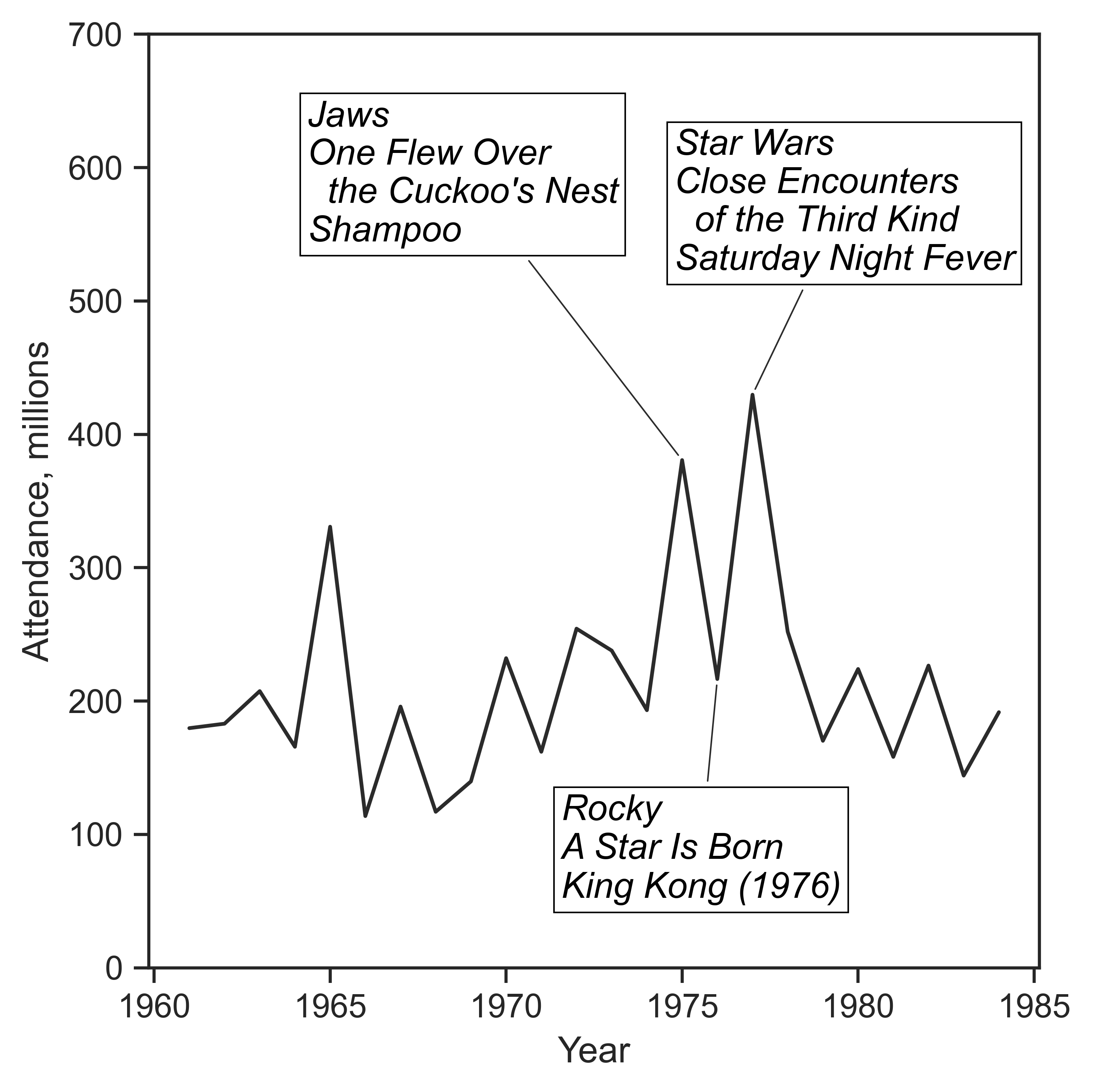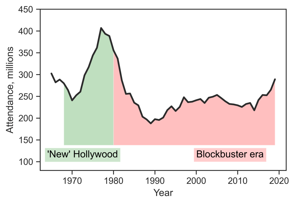 Note: Attendance equals total US gross revenues of the top three films, divided by average US ticket price. Sources: Bradley Schauer and David Bordwell, ‘Appendix: A Hollywood Timeline, 1960–2004,’ in Bordwell (2006). For years not covered in Schauer and Bordwell, see www.boxofficemojo.com for yearly gross revenues of individual films and National Association of Theatre Owners for average US ticket price.