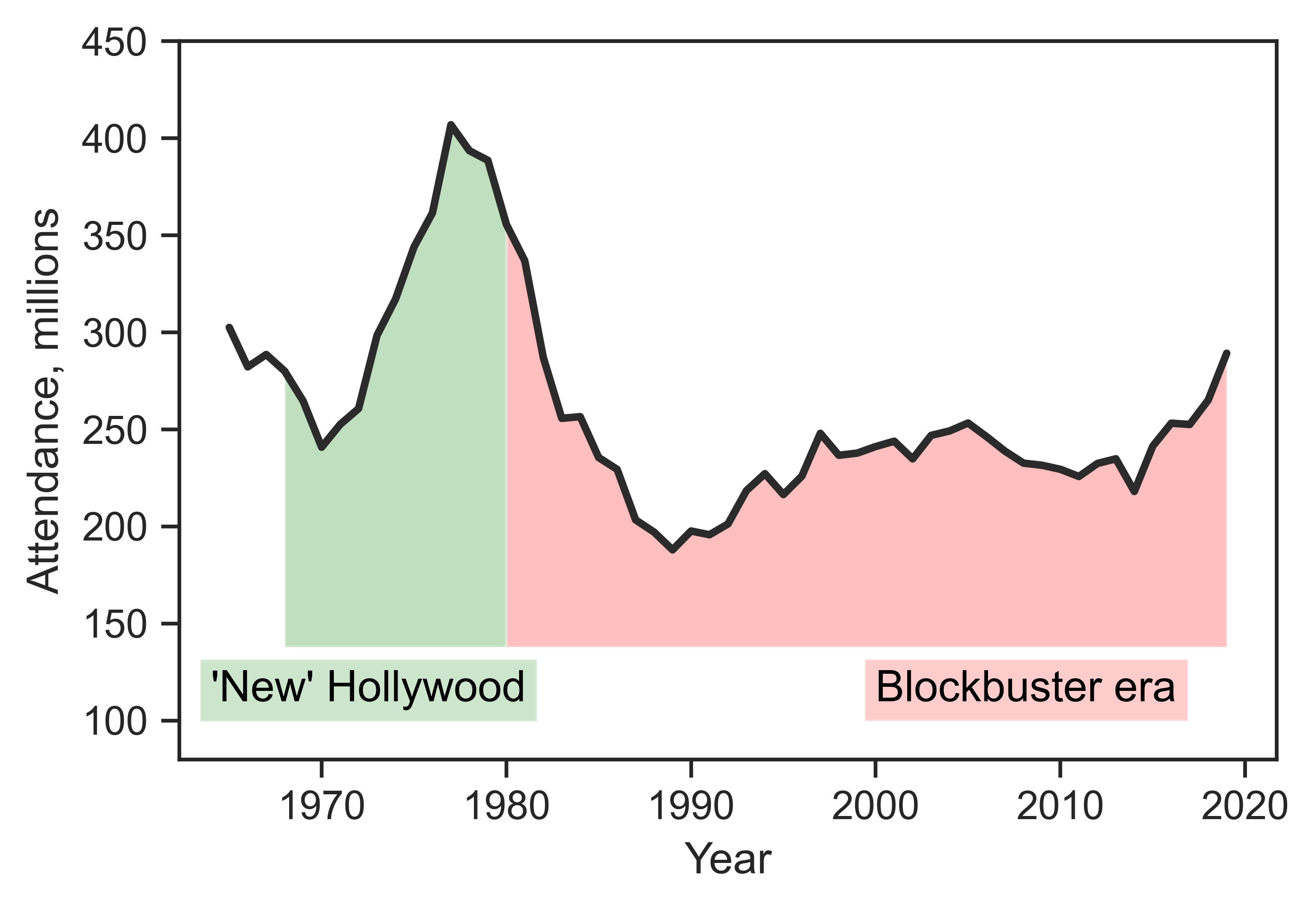 Note: Attendance equals total US gross revenues of the top five films, divided by average US ticket price. Sources: Bradley Schauer and David Bordwell, ‘Appendix: A Hollywood Timeline, 1960–2004,’ in Bordwell (2006). For years not covered in Schauer and Bordwell, see www.boxofficemojo.com for yearly gross revenues of individual films and National Association of Theatre Owners for average US ticket price.