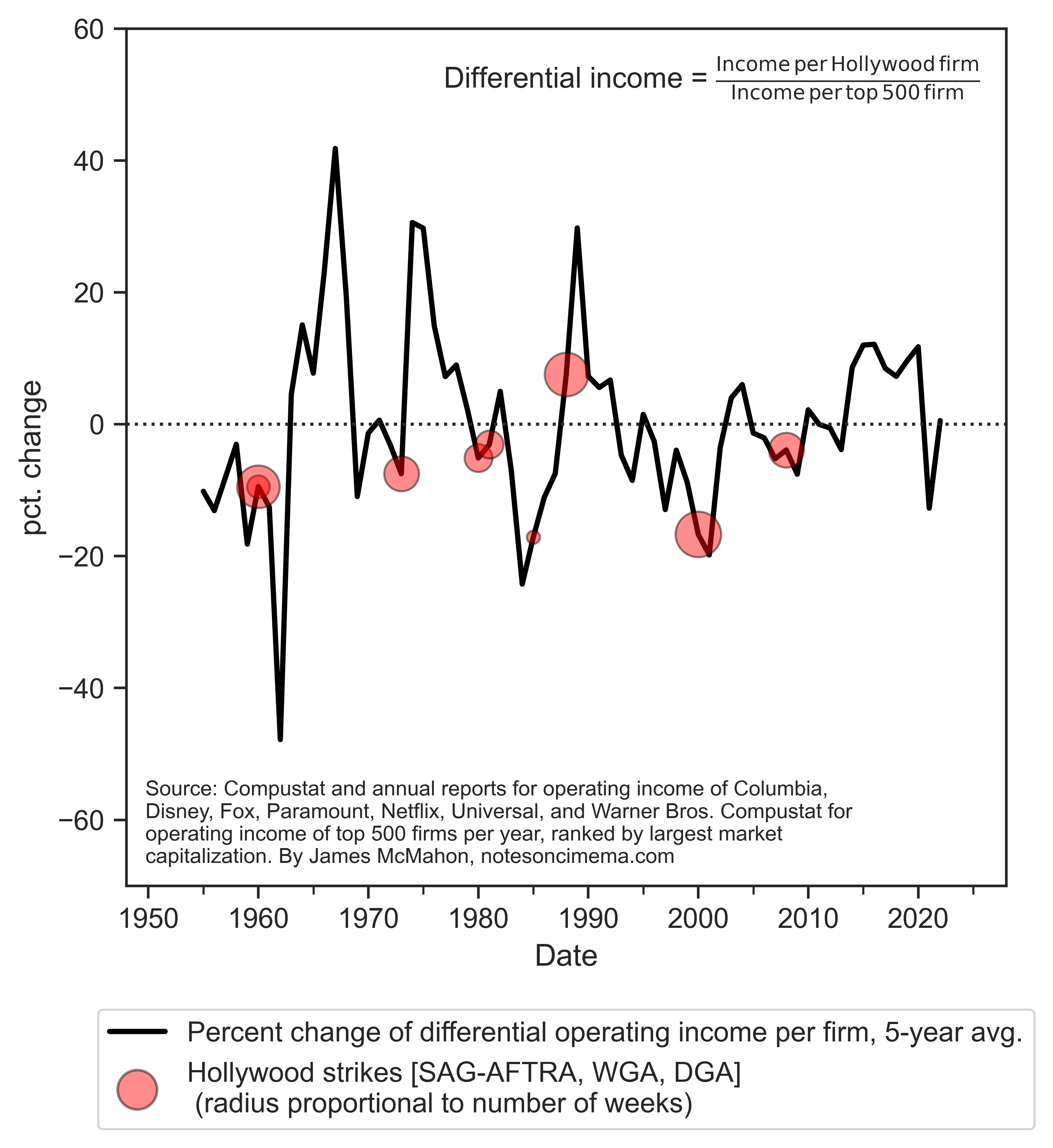 The red circles are major strikes in Hollywood between 1950 and 2022 (see Table 1). The majority of the red circles are below zero, when the differential operating profits of Hollywood are falling. To borrow a phrase used in the some of the research of Bichler and Nitzan and a recent paper by Chris Moure, pressure for Hollywood studios to reject bargaining proposals increases when its differential accumulation is in a “danger zone”. Unfortunately this danger zone is not defined by the isolated conditions of people working in film and television. The zone is mainly demarcated by the financial performances of other dominant capitalists.