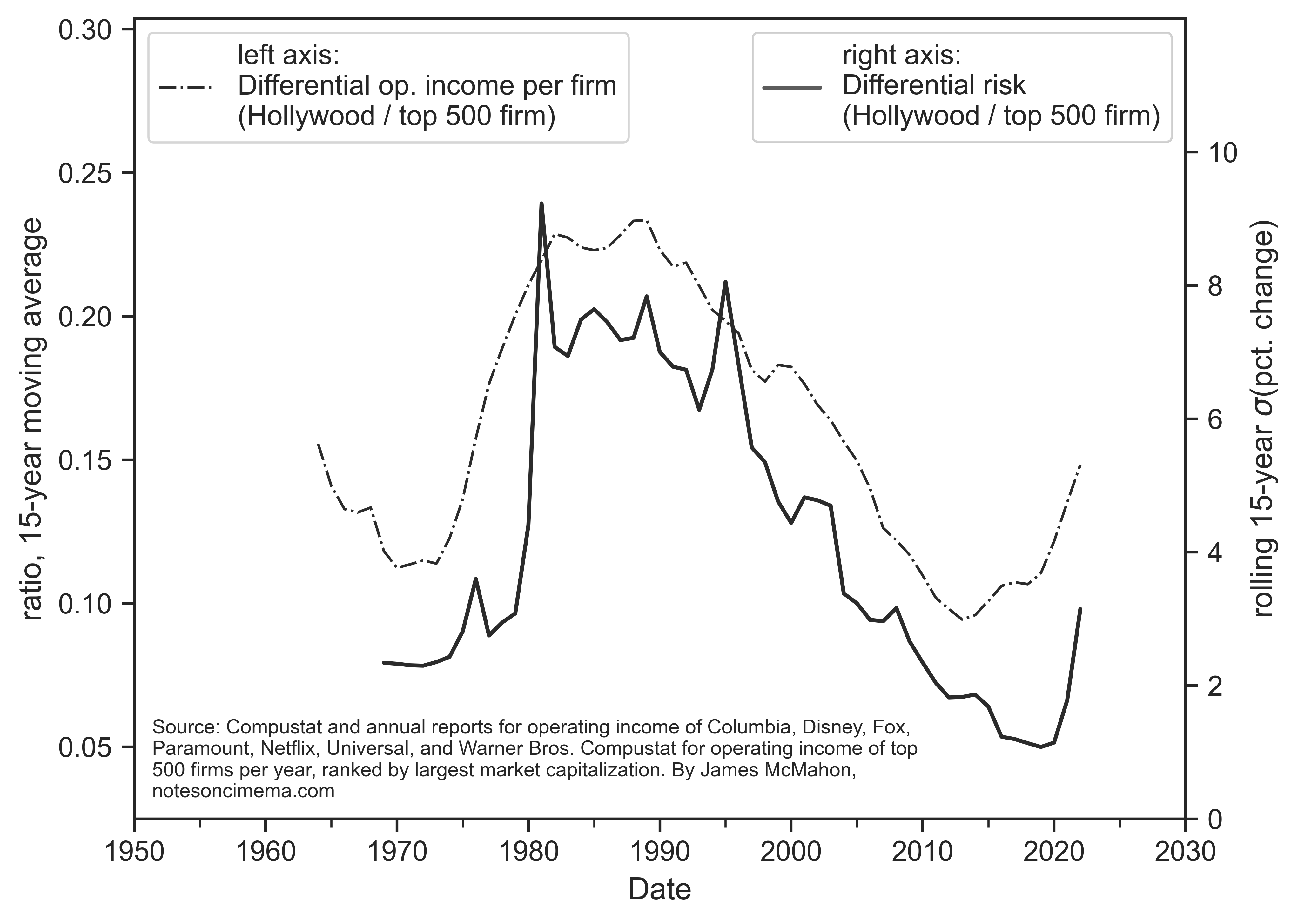 At a much larger scale than two producers trying to pitch a movie idea, Figure 1 visualizes the tricky relationship between profit and risk in the Hollywood film business. The left axis plots the per-firm differential operating profits of the major Hollywood studios (Columbia, Disney, Fox, Paramount, Netflix, Universal, and Warner Bros.). The series is smoothed as a 15-year moving average. The right axis plots my approach to measuring differential risk. A measure of differential risk is produced in three steps. First I calculate the annual percent changes of a 5-year smoothed series of operating profits per firm — for both the major Hollywood studios and the top 500 firms in Compustat, which is the database that was used to construct our benchmark that proxies the S&P 500. In the second step we apply a 15-year rolling standard deviation to both series of percent changes. For example, a measure in 1990 would be the standard deviation of the percent changes of operating profits from 1975 to 1990. Third, we divide Hollywood’s measure of risk by the benchmark, the measure of risk for the top 500 firms.