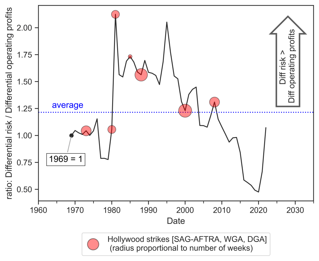 Figure 1 demonstrates how, over the long run, differential profits in Hollywood are not independent from differential risk. The two series in Figure 1 are technically “backward-looking”, as they measure published earnings, instead of expected profits, and volatility, instead of “forward-looking” confidence in future expectations. Nevertheless, it is the strength of the relationship that can help explain the tendency for labour strife to occur when Hollywood is in a danger zone. To just keep pace with other dominant capitalist firms, Hollywood’s earnings need to increase when the earnings of other firms are increasing. When the profits of the major Hollywood studios stagnate, there are infinite possibilities in the imagination of how Hollywood can increase profits from new or better creative strategies — e.g., green-light projects from new talent, search for alternative or marginalized stories, break from industry norms of pacing, play with visual styles. But strategies of more or better creative growth are foreclosed by any expected rise of differential risk, as a rise of risk deflates the level of expected profits (just like in the example of Producer B’s pitch).