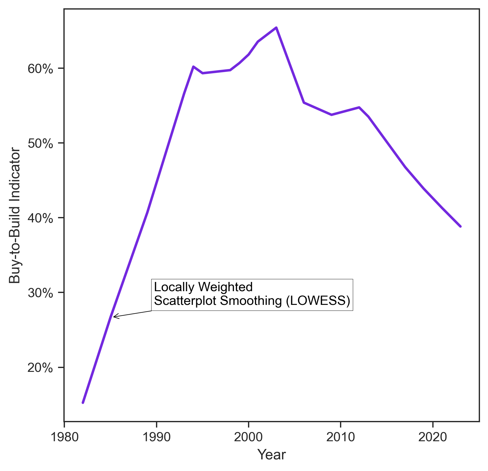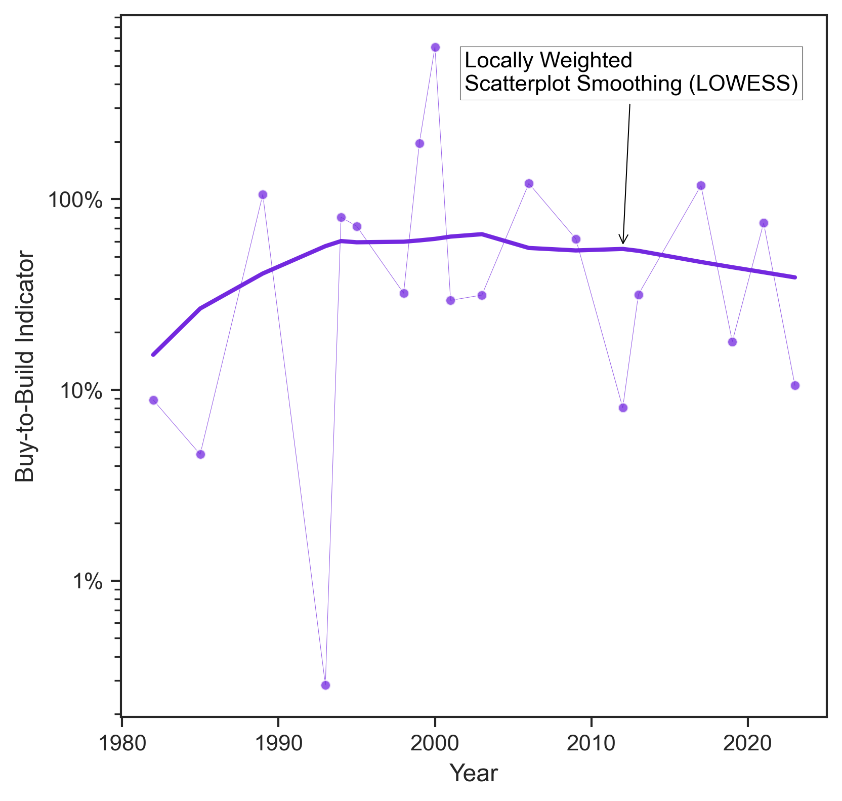 Interestingly, Hollywood’s buy-to-build indicator stagnates after 2000. Such a result might be surprising when we know there have been, since 2000, several mergers and acquisitions in Hollywood — including a big one, where Disney purchased 21st Century Fox in 2019. Figure 2 helps us see the curious situation better. It shows just the trend line from Figure 1.